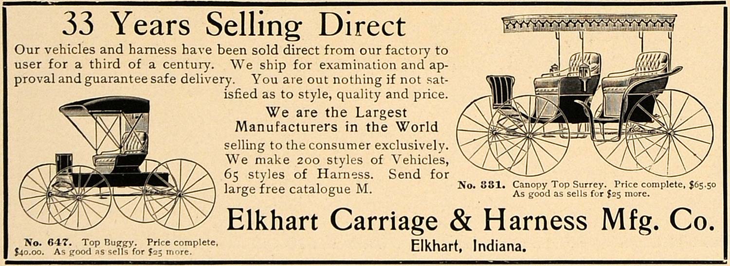This is an original 1906 black and white print ad for the Top Buggy No. 647 and Canopy Top Surrey No. 331 from Elkhart Carriage & Harness Manufacturing Company located in Elkhart, Indiana.