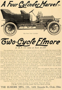This is an original 1906 black and white print ad for a Four Cylinder Marvel Two Cycle Elmore by The Elmore Manufacturing Company located at 1604 Amanda Street, Clyde, Ohio.