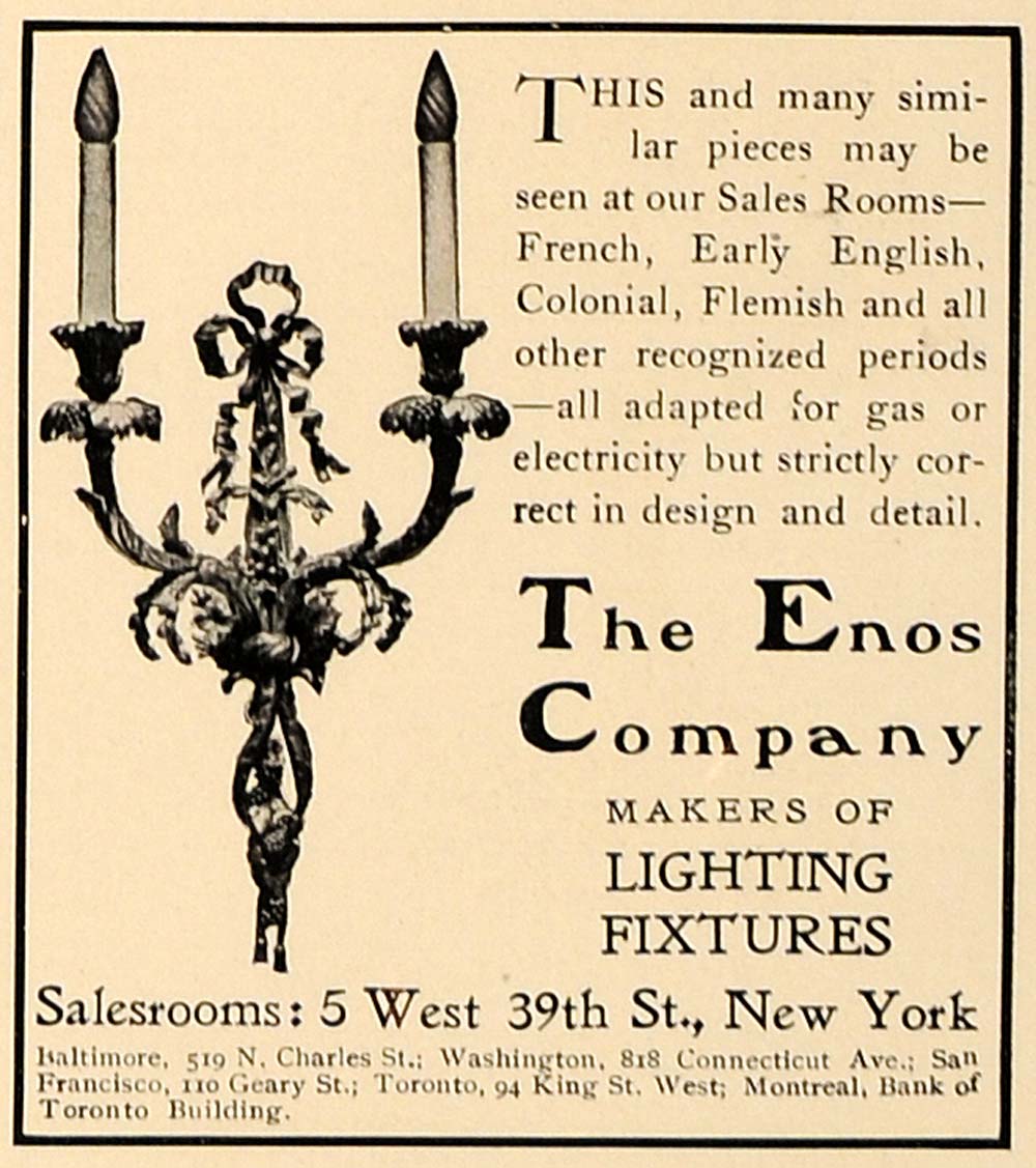 This is an original 1906 black and white print ad for lighting fixtures by The Enos Company located at 5 West 39th Street, New York. Other locations: 519 N. Charles Street, Baltimore; 818 Connecticut Ave, Washington; 11 Geary Street, San Francisco; 94 King Street West, Toronto; Bank of Toronto Building, Montreal.