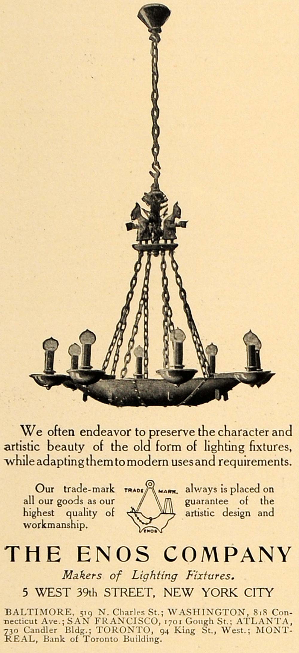 This is an original 1906 black and white print ad for The Enos Company, Makers of Lighting Fixtures.