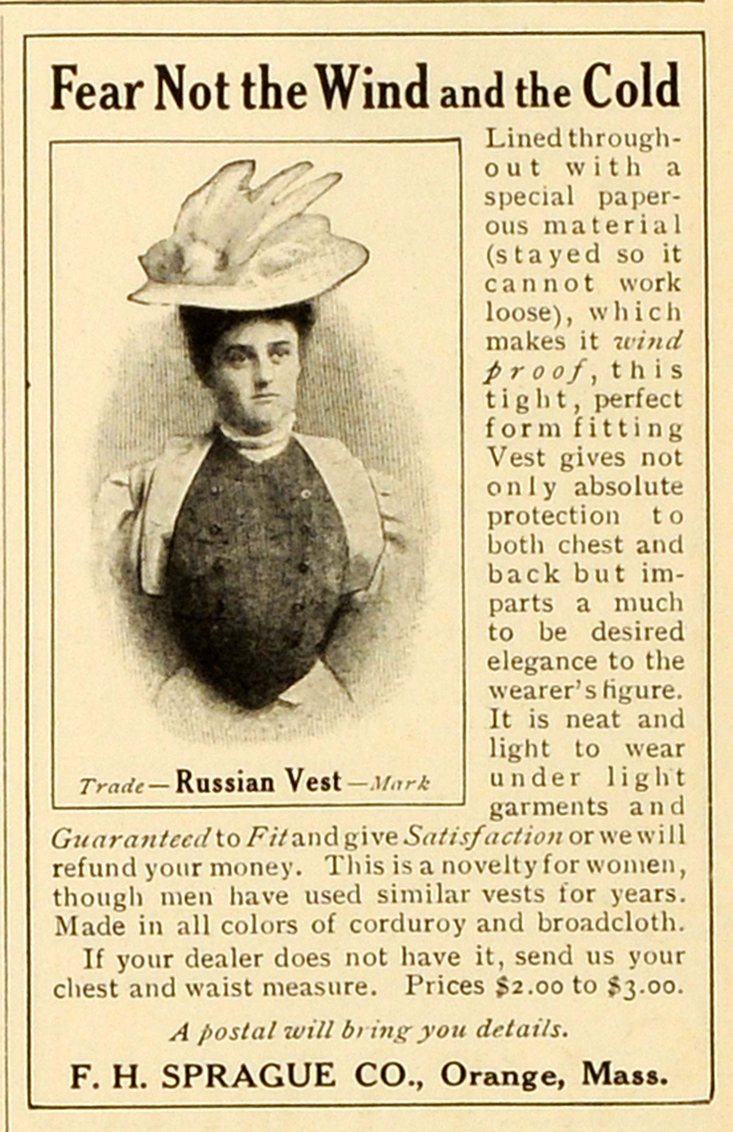 This is a small original 1906 black and white print ad for the Russian Vest from F. H. Sprague Company located in Orange, Massachusetts.