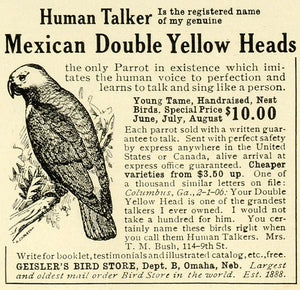 This is a small original 1906 black and white print ad for Geisler's Bird Store in Omaha, Nebraska; this ad features their Mexican Double Yellow Head Birds that are for sale.