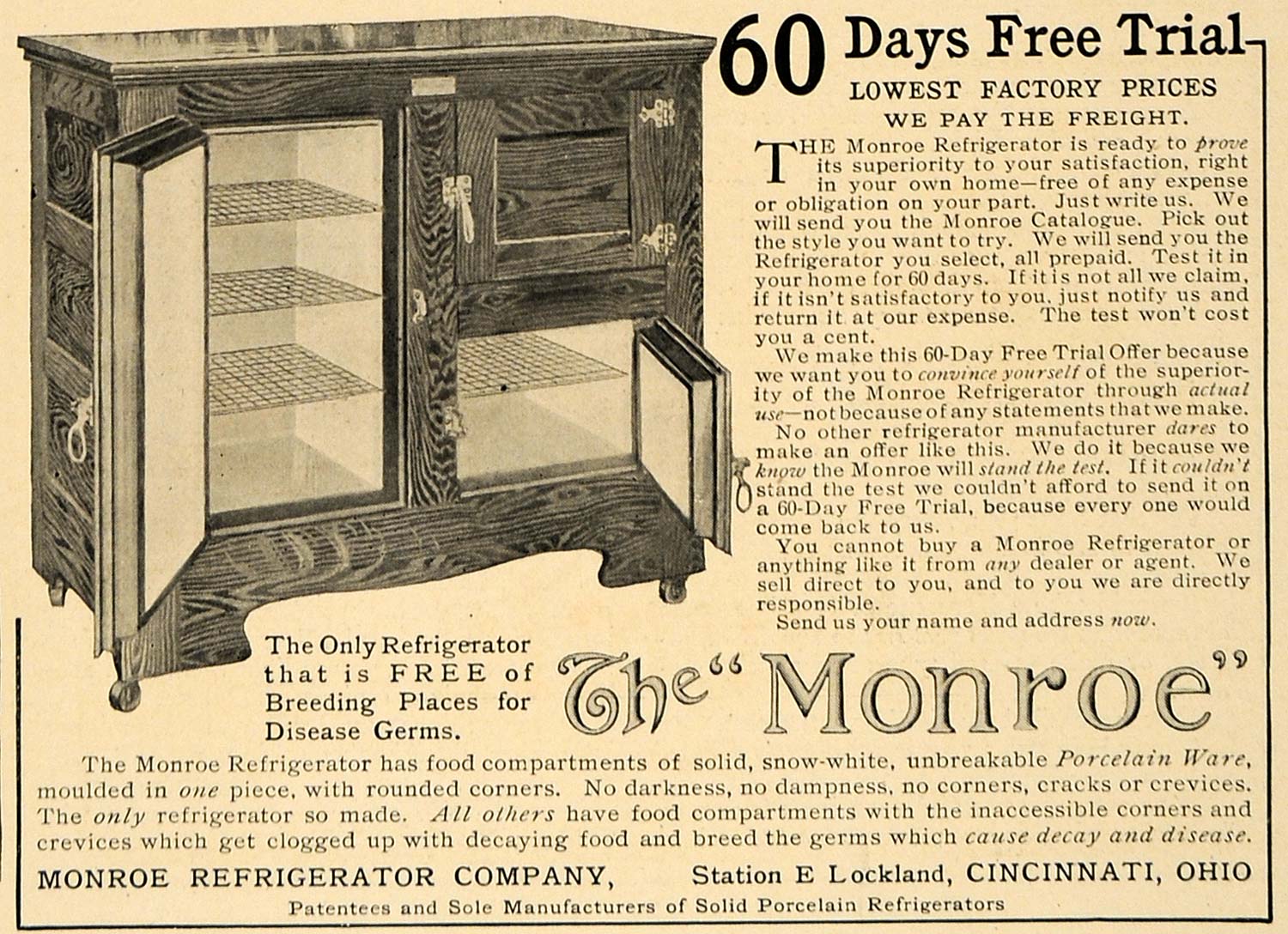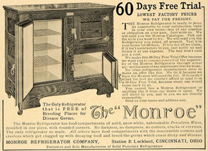 This is an original 1906 black and white print ad for the "Monroe" refrigerator by the Monroe Refrigerator Company located in Cincinnati, Ohio.