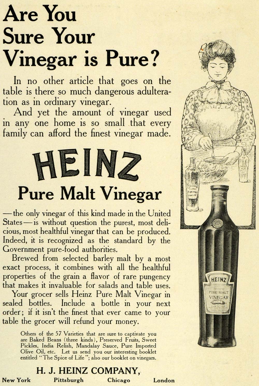 This is an original 1906 black and white print ad for the H. J. Heinz Company of New York, Pittsburgh, Chicago, and London. This ad features their Heinz Pure Malt Vinegar for cooking and baking.