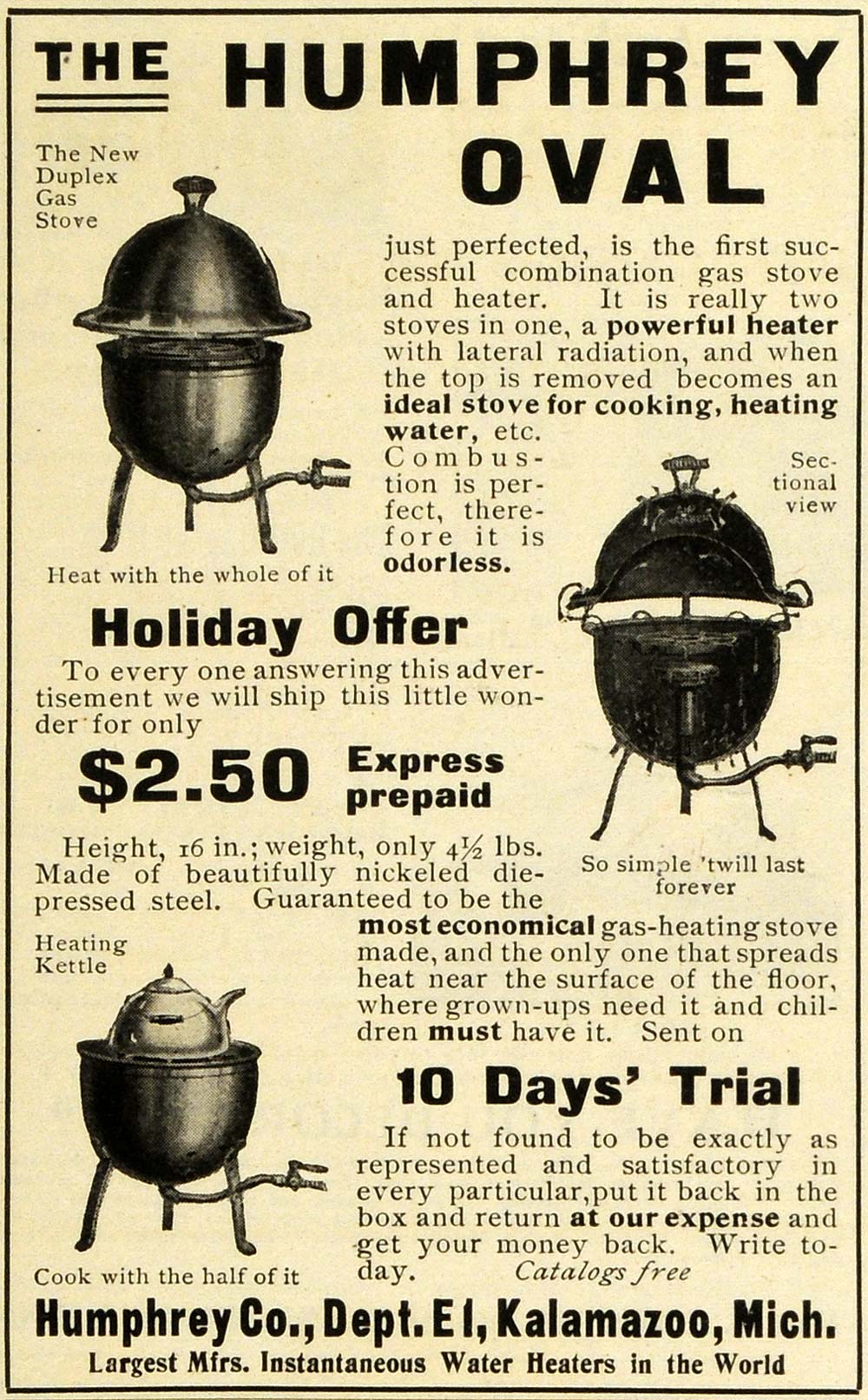 This is an original 1906 black and white print ad for the Duplex Gas Stove and Heating Kettle by Humphrey Company of Kalamazoo, Michigan.