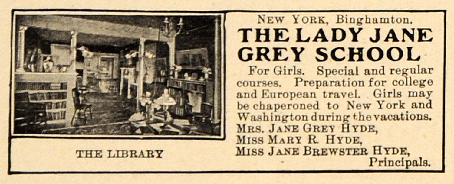 This is a tiny original 1906 black and white print ad for The Lady Jane Grey School in Binghamton, New York, under principalship of Mrs. Jane Grey Hyde, Miss Mary R. Hyde and Miss Jane Brewster Hyde.