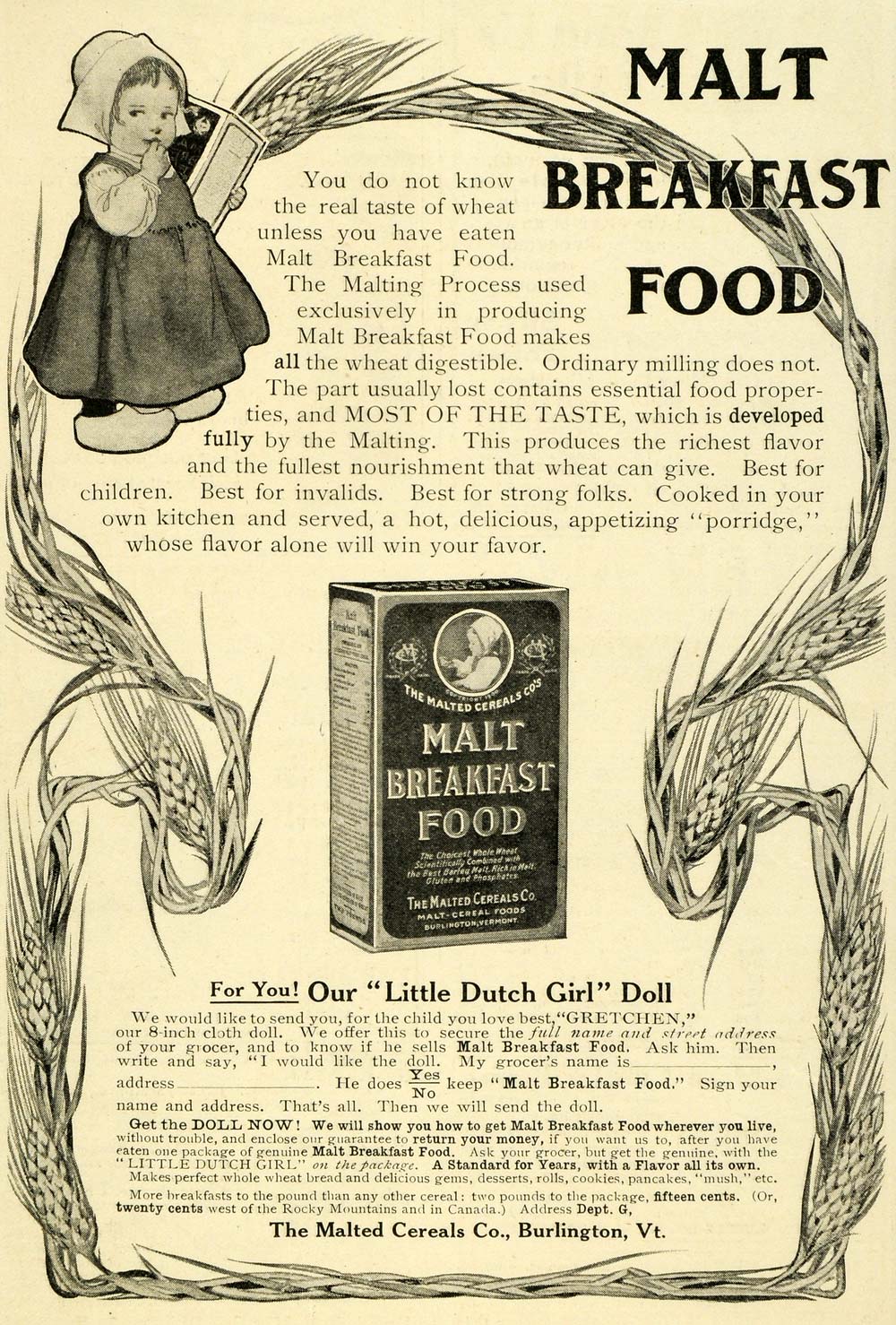 This is an original 1906 black and white print ad for the Malted Cereals Company of Burlington, Vermont; this ad features their Malt Breakfast Food.