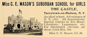 This is an original 1906 black and white print ad for Miss C. E. Mason's Suburban School for Girls, The Castle located in Tarrytown-on-Hudson, New York.