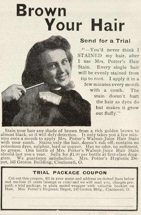 This is an original 1906 black and white ad for Mrs. Potter's Walnut Juice Hair Stain from Mrs. Potter's Hygienic Depot, Suite 145, Groton Building, Cincinnati, Ohio.