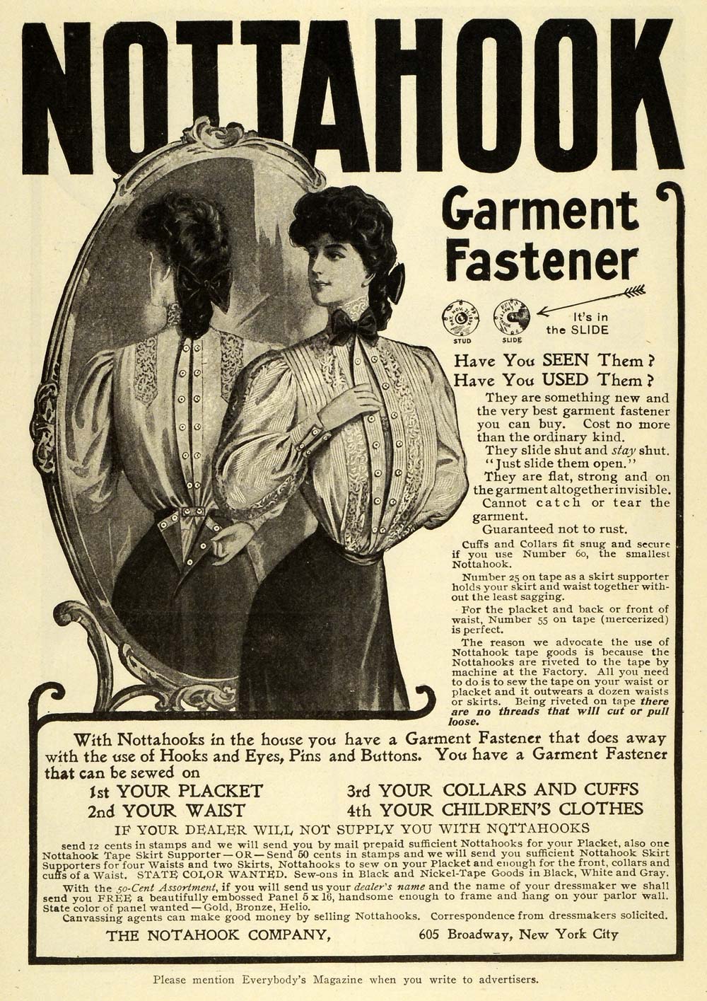 This is an original 1906 black and white print ad for the Nottahook garment fastener from Notahook Company located at 605 Broadway, New York City.