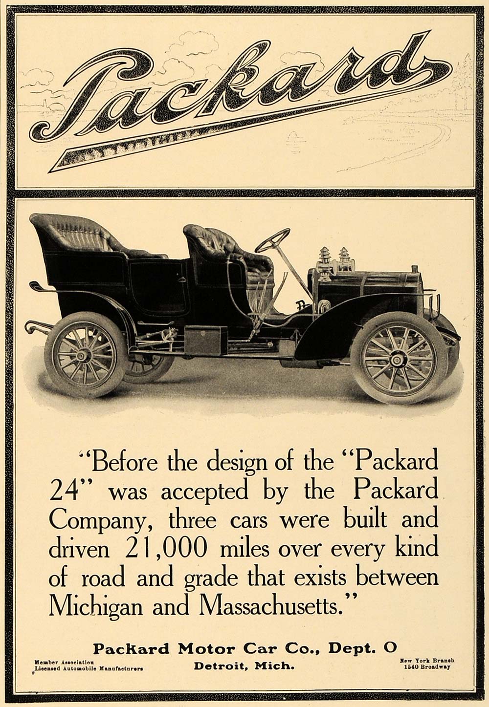 This is an original 1906 black and white print ad for the Packard 24 a 5 person touring car by the Packard Motor Car Company located in Detroit, Michigan.