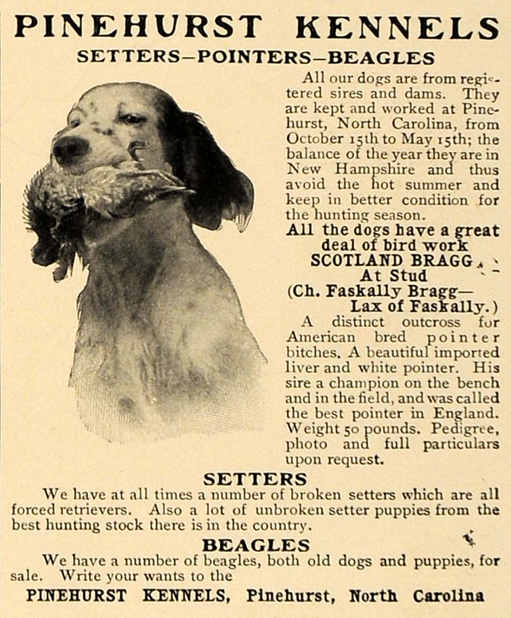 This is an original 1906 black and white print ad for Pinehurst Kennels located in Pinehurst, North Carolina.
