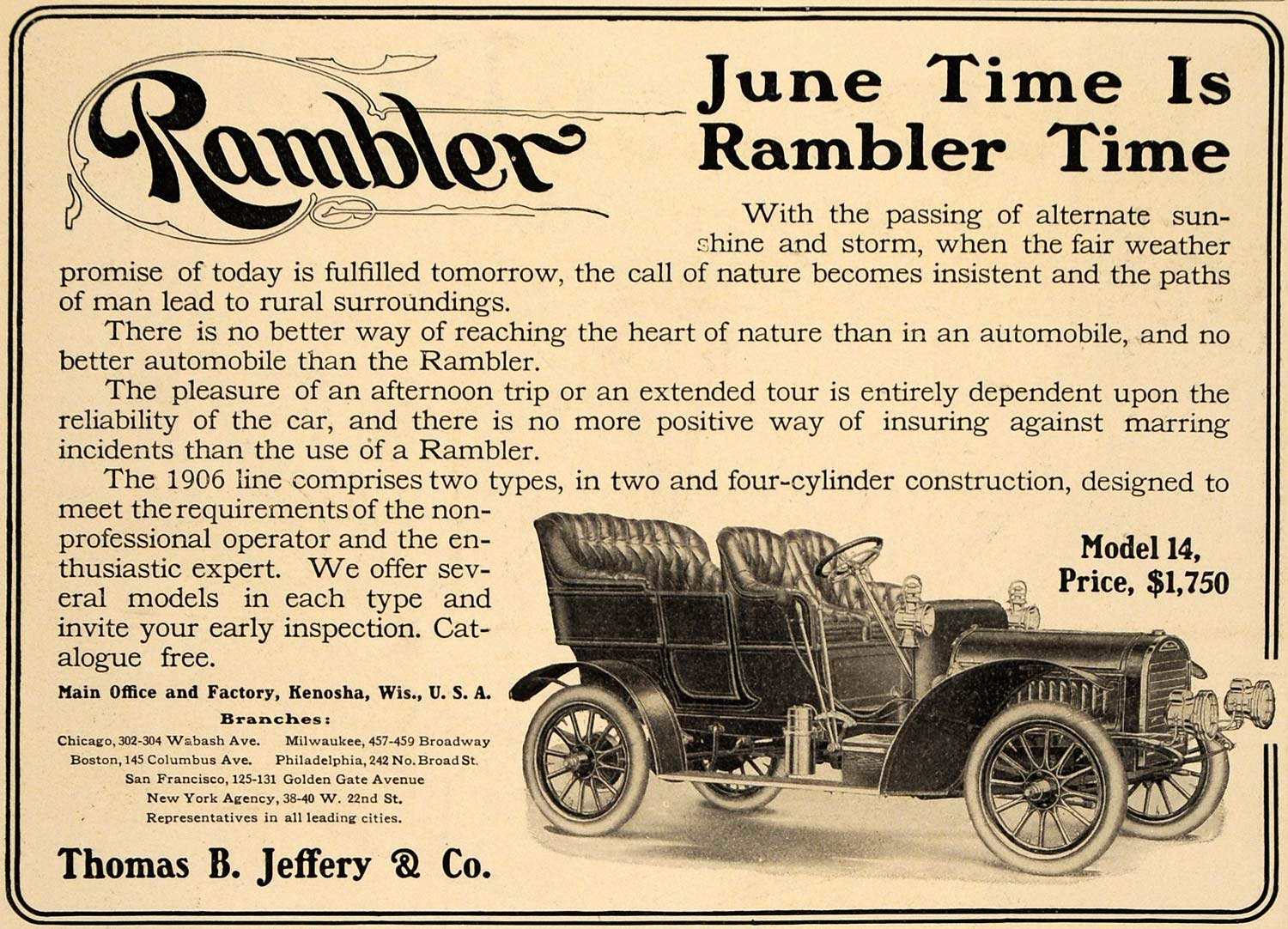 This is an original 1906 black and white print ad for Model 14 Rambler automobile by Thomas B. Jeffery located in Kenosha, Wisconsin.