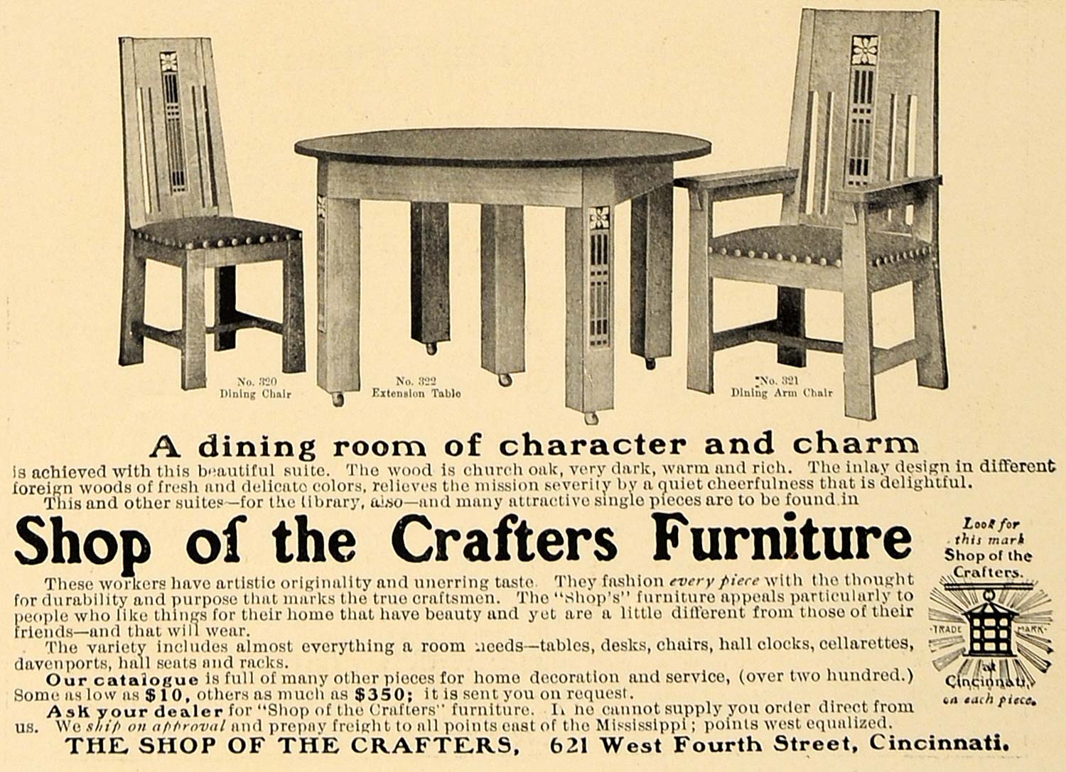 This is an original 1906 black and white print ad for The Shop of the Crafters, specially featuring a dining room set in Church Oak Wood with Dining Chair Model No. 323, Dining Chair Model No. 320 and Extension Table Model No. 322. The company was founded around 1904, by Oscar Onken, who actually began his work as a picture frame builder around 1880. The company's name went through a variety of changes from Onken & Co. to The Oscar Onken Co, and finally Shop of the Crafters, where Onken focused his specialties around furniture. The 1906 furniture catalog featured an assortment of designs by Hungarian Professor of Design, Paul Horti.