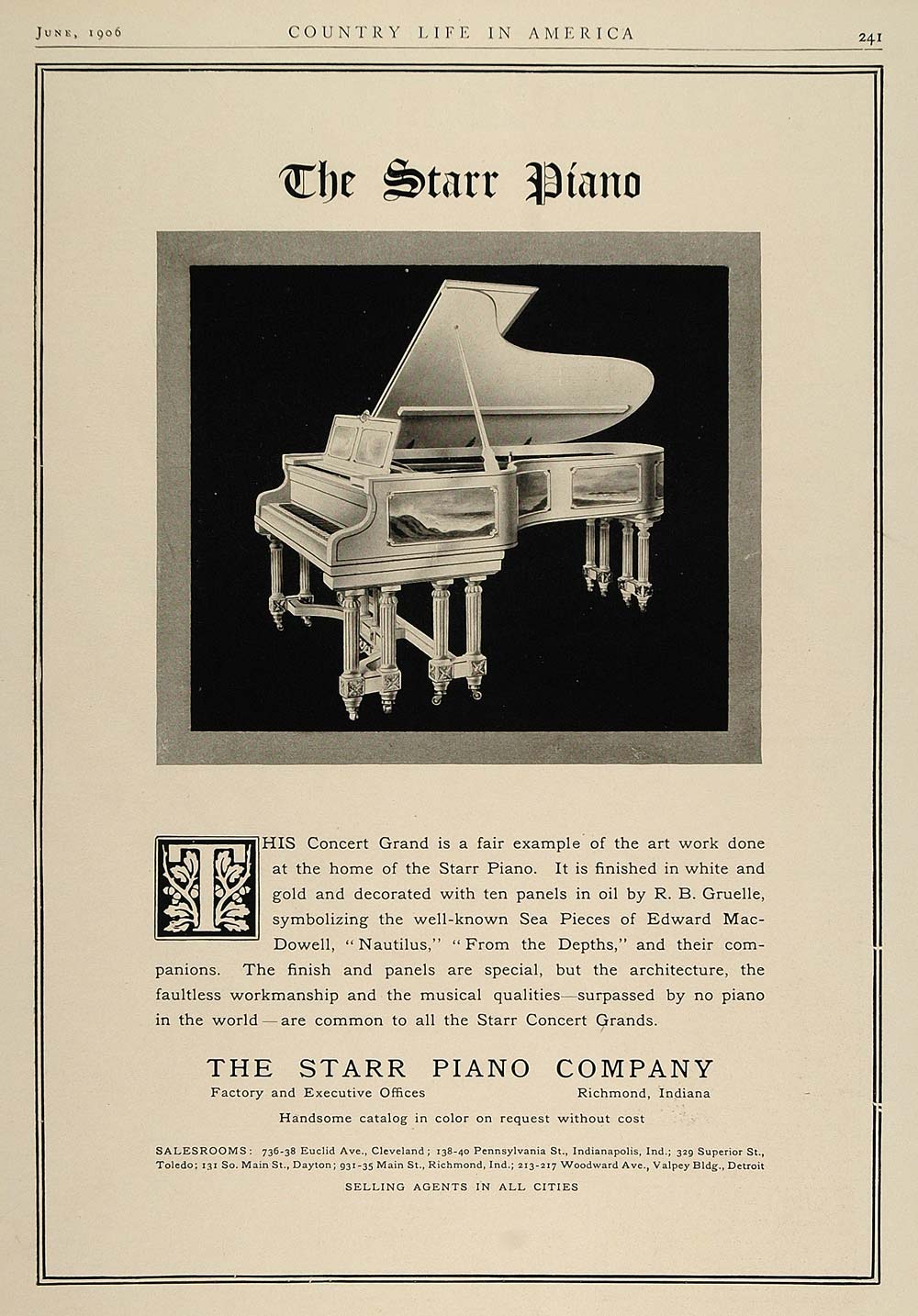 This is an original 1906 black and white print ad for the Starr Concert Grand Piano from The Starr Piano Company of Richmond, Indiana, with side panels decorated in oil by R. B. Gruelle.