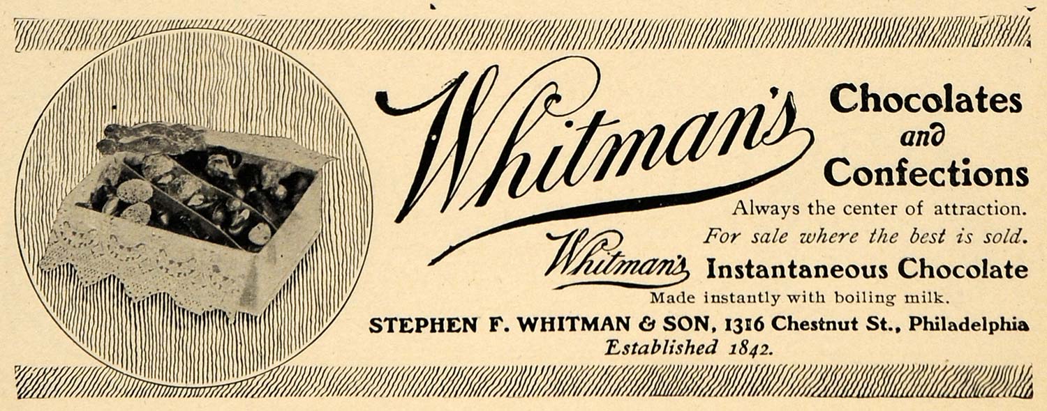 Whitman's Chocolates. The chocolatier and confectionary of WhitmanÕs Chocolates has been in existence since 1842, when an ambitious 19-year old Stephen F. Whitman first opened his candy shop in Philadelphia. European sailors and their wives, who frequently brought chocolate delicacies with them overseas, inspired Whitman to create similar confections that resembled the fine sweets of Europe. However, just prior to the onset of the U. S. Civil War, Whitman began utilizing the latest popular advertising medium of newspapers to further promote his delicacies. By 1866, WhitmanÕs confections exploded in popularity and he was forced to expand his business, thus, occupying the entirety of the building on 12th and Market Streets in Philadelphia. By 1912, the company was the first among its kind to utilize cellophane in its packaging in efforts to preserve maximum freshness among the candies. Today, WhitmanÕs Chocolates remains one of AmericaÕs longest running and most popular confectionaries, though it is now owned by Russell Stover.