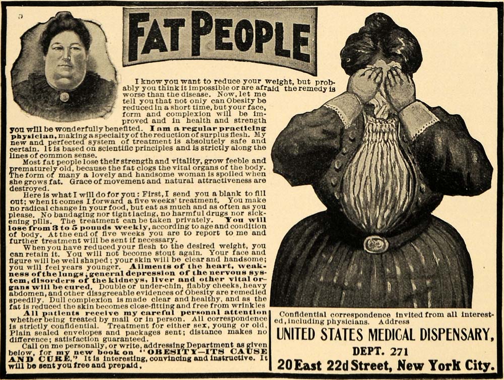 This is an original 1906 black and white print ad for the United States Medical Dispensary treating obesity located at 20 East 22d Street, New York.