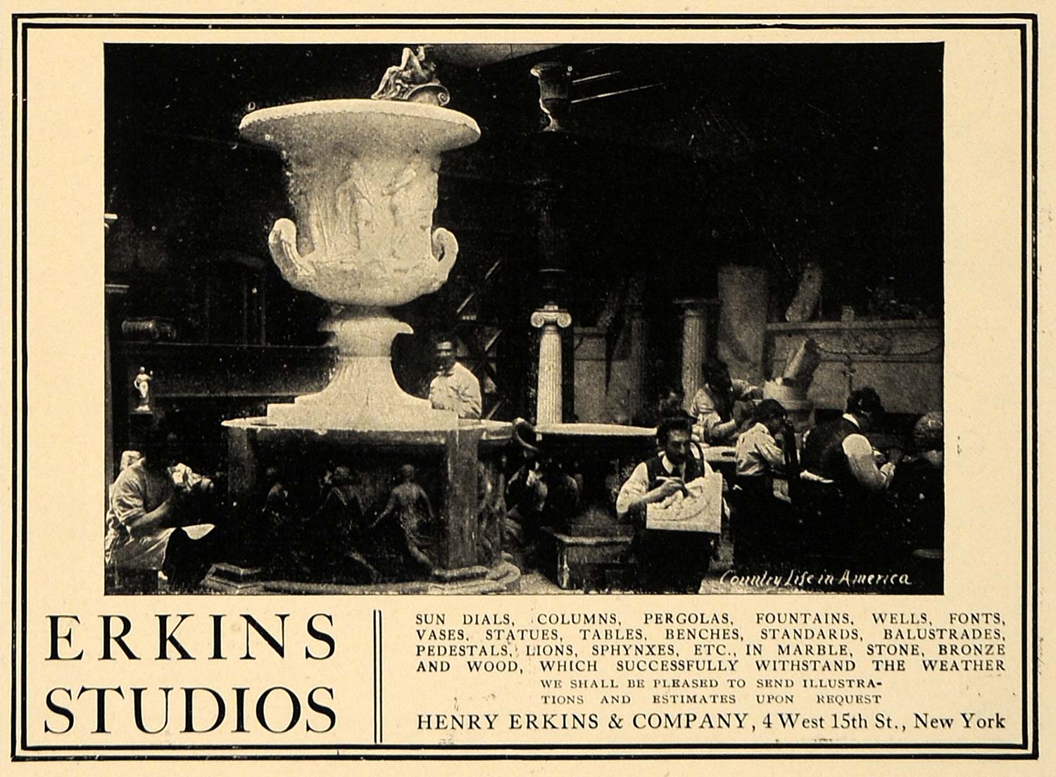 This is an original 1906 black and white print ad for Erkin Studios garden decorations and furniture by Henry Erkins and Company
