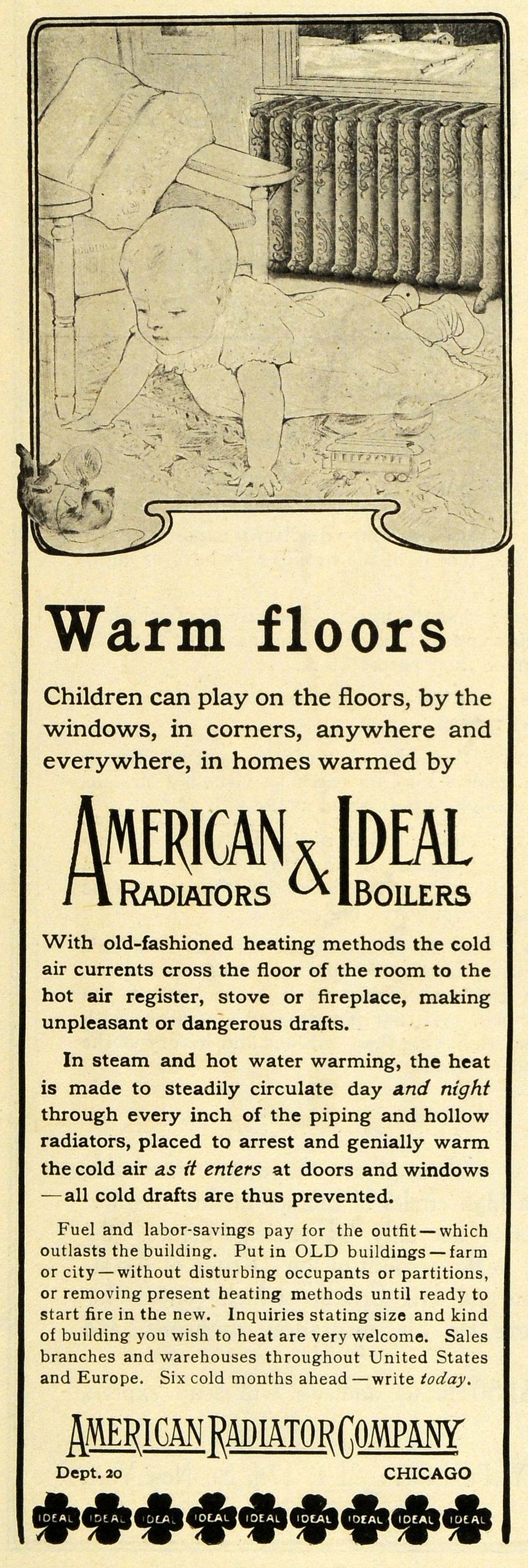 This is a small original 1906 black and white print ad for American Radiators and Ideal Boilers by the American Radiator Company of Chicago.