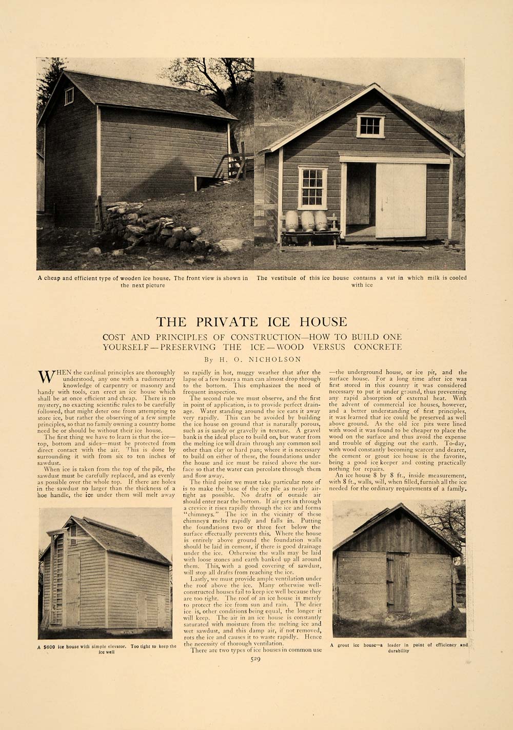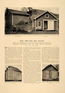 This is an original 1906 2 page article titled, "The Private Ice House: Cost and Principles of Construction-- How to Build One Yourself-- Preserving the Ice-- Wood Versus Concrete," by H. O. Nicholson. The article features images of the different types of homes possible. Please see additional images and note that the 2 pages are printed on 1 page-- front and back.
