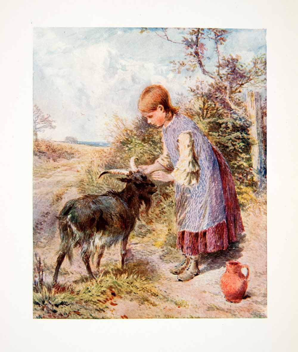 This is an original 1906 color print of a girl playing with a goat. The original artwork in this print was created by Myles Birket Foster (1825-1899). Foster was an English watercolor artist and illustrator. He was born in North Shields, England, to a Quaker family. Foster was apprenticed to a wood engraver named Ebenezer Landells in London and worked as an illustrator for books and periodicals. He is also known for his landscapes which he painted as he traveled throughout Europe.