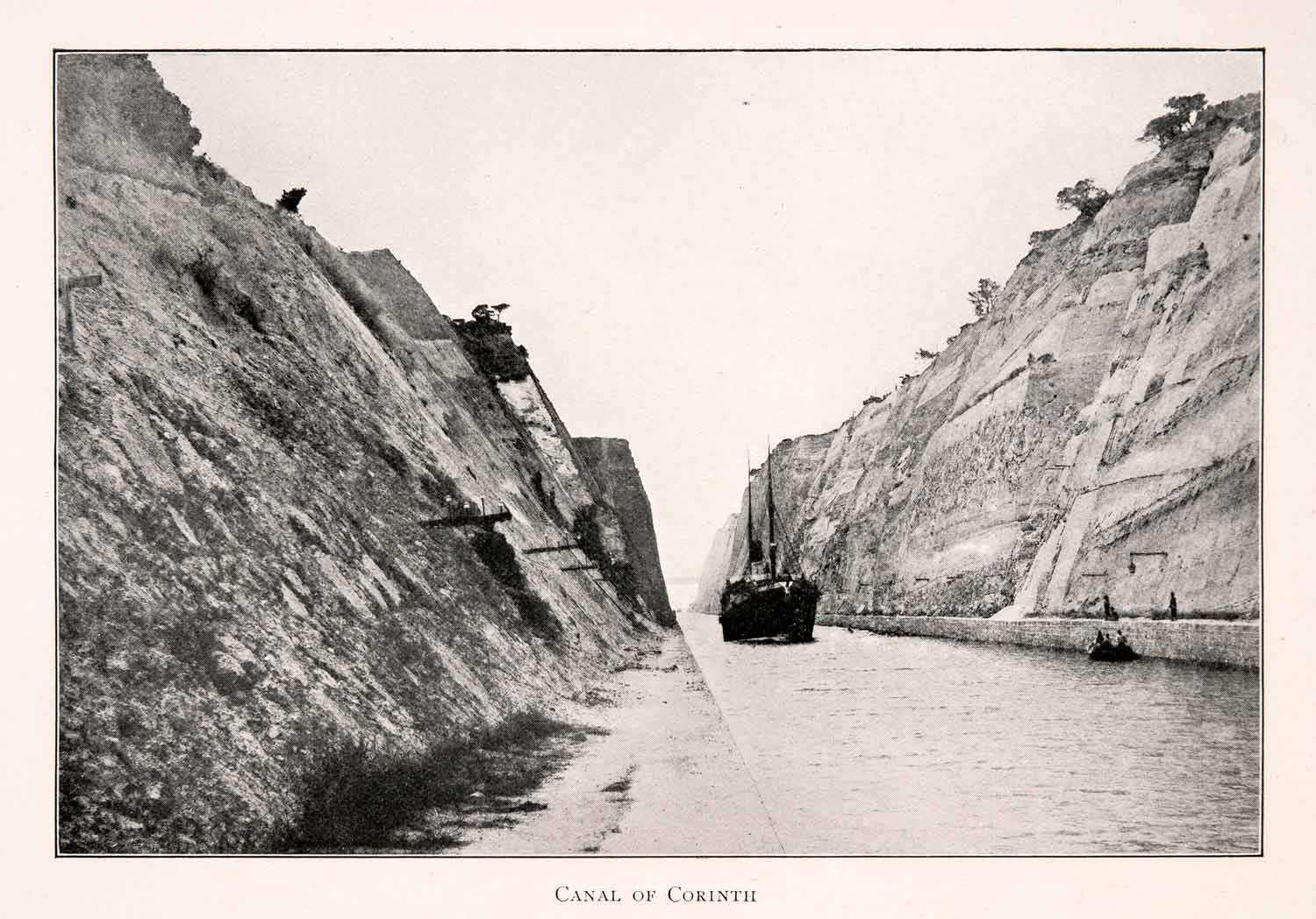 This is an original 1906 black and white halftone print of the Canal of Corinth in Greece.