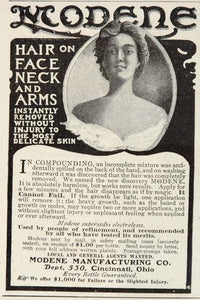 This is an original 1906 black and white print ad for Modene, an early hair removal treatment from the Modene Manufacturing Co., Cincinnati, Ohio.
