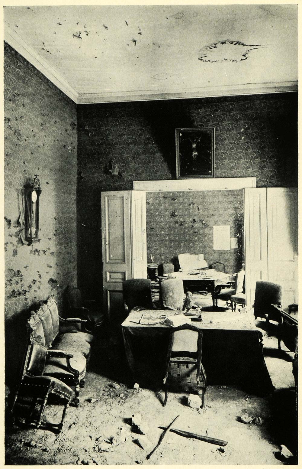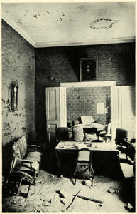 This is an original 1906 halftone print of a destroyed private room in the Palace of the Governor of Mendoza. Note the bullet holes in the walls and ceilings as a result of the Argentine Revolution of 1905, also known as the Radical Revolution.