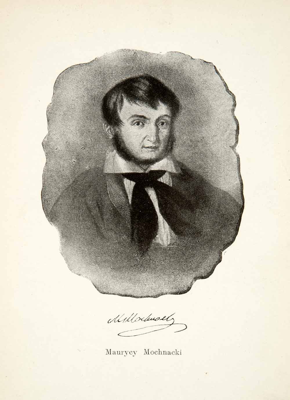 This is an original 1906 black and white halftone print of a portrait of Polish literary, theater, and music critic and political activist Maurycy Mochnacki (1803-1834). He participated in the November Uprising of 1830-31 against the Russian Empire and was awared the War Order of Virtuti Militari for his military actions during the Uprising. He later emigrated to France where he died in 1834.