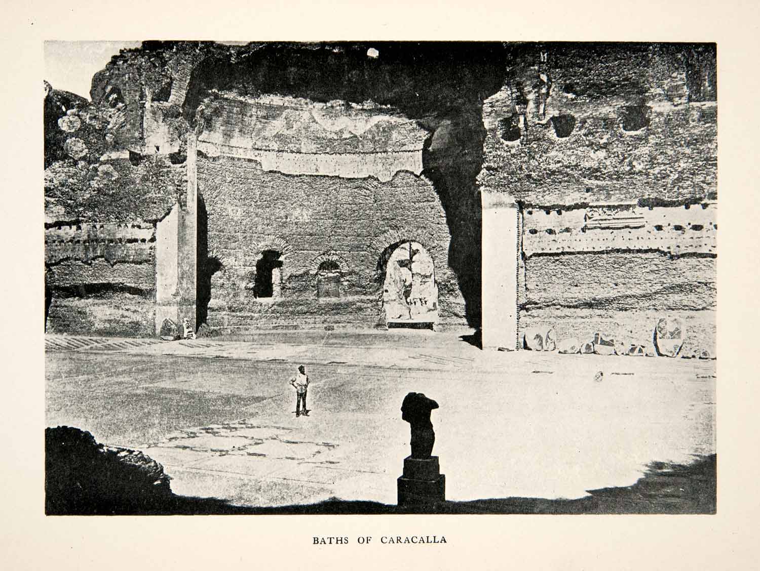 This is an original 1906 black and white halftone print of the ruins of the Thermae Antoninianae (Caracalla Bath) in Rome, Italy.