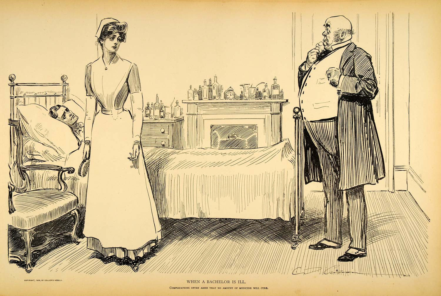 "Complications often arise that no amount of medicine will cure." This is an original 1906 halftone print of a drawing by Charles Dana Gibson. The drawing has a copyright date of 1903 by Collier's Weekly. (Please note that, typical of halftone prints, there is printing on the reverse.)