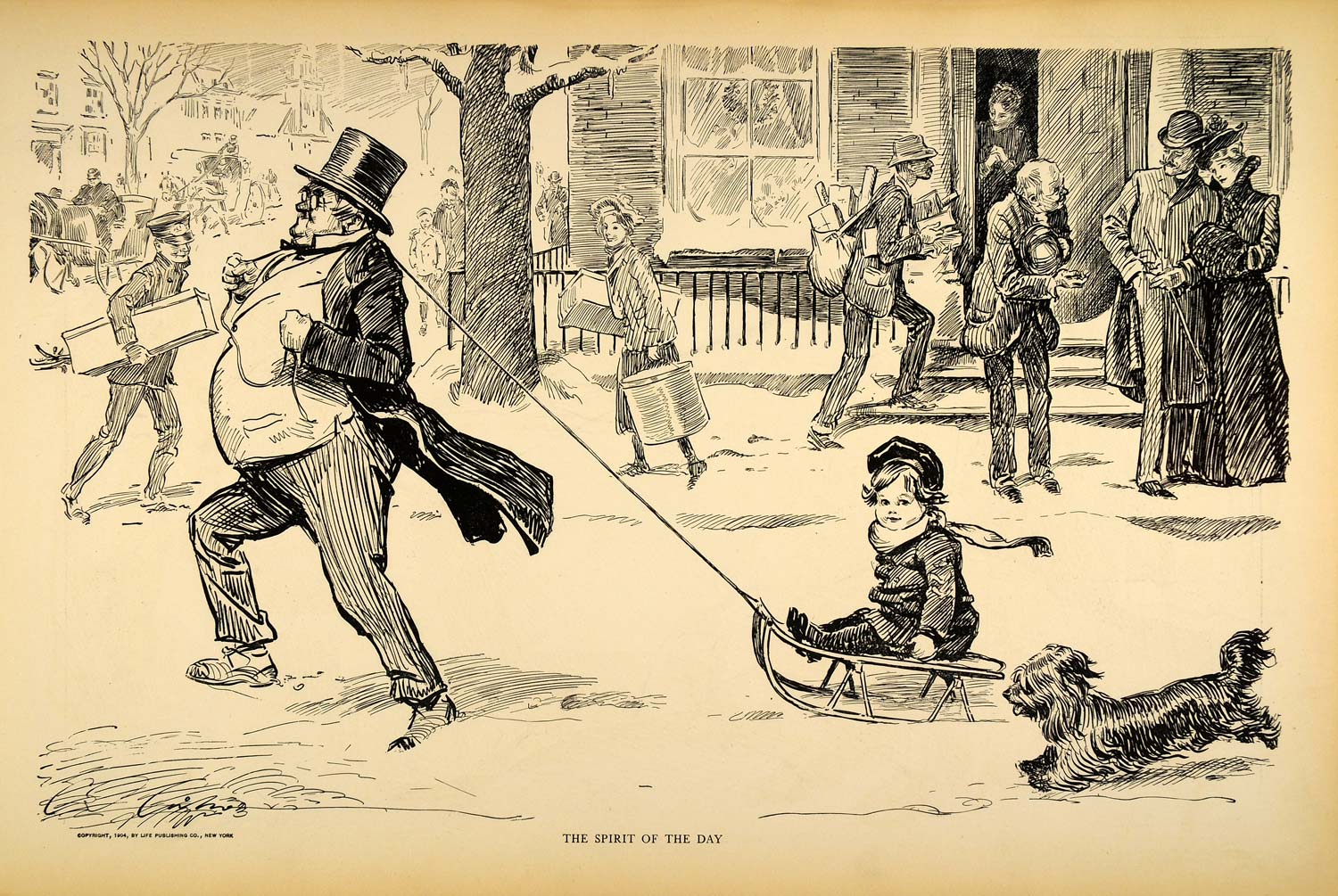 1906 Print Charles Dana Gibson Child Sled Victorian Christmas Dog Drawing Sketch