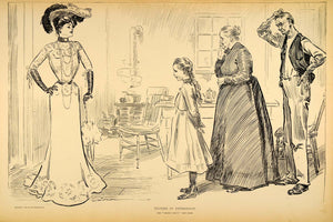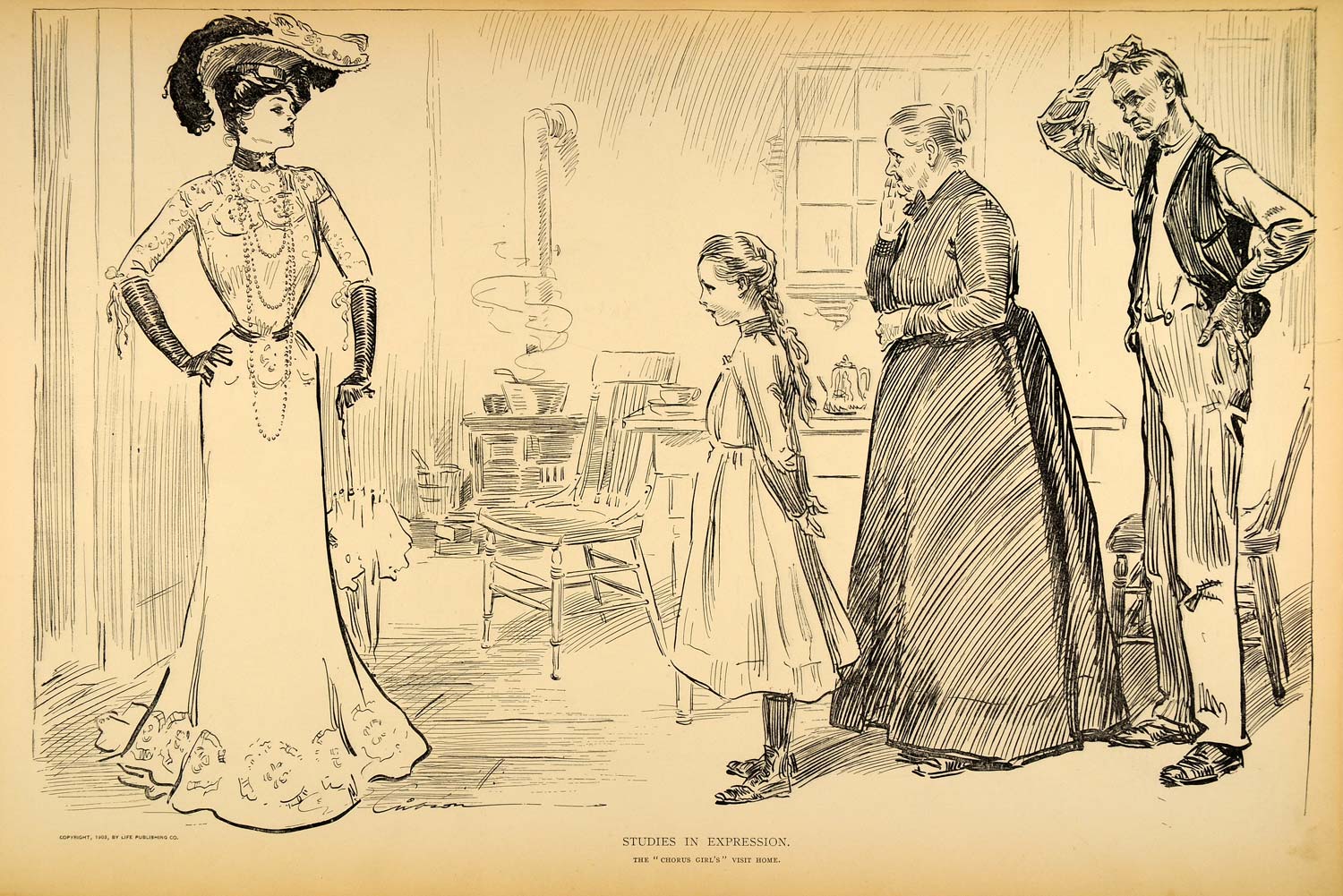 "The chorus girl's visit home." This is an original 1906 halftone print of a drawing by Charles Dana Gibson. The drawing has a copyright date of 1903 by Life Publishing Co. (Please note that, typical of halftone prints, there is printing on the reverse.)
