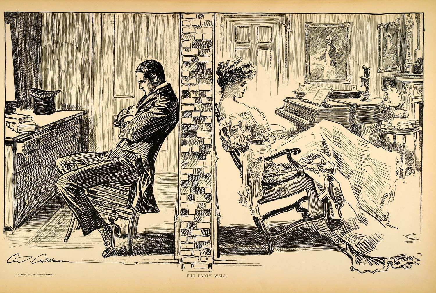 This is an original 1906 halftone print of a drawing by Charles Dana Gibson. The drawing has a copyright date of 1903 by Collier's Weekly. (Please note that, typical of halftone prints, there is printing on the reverse.)