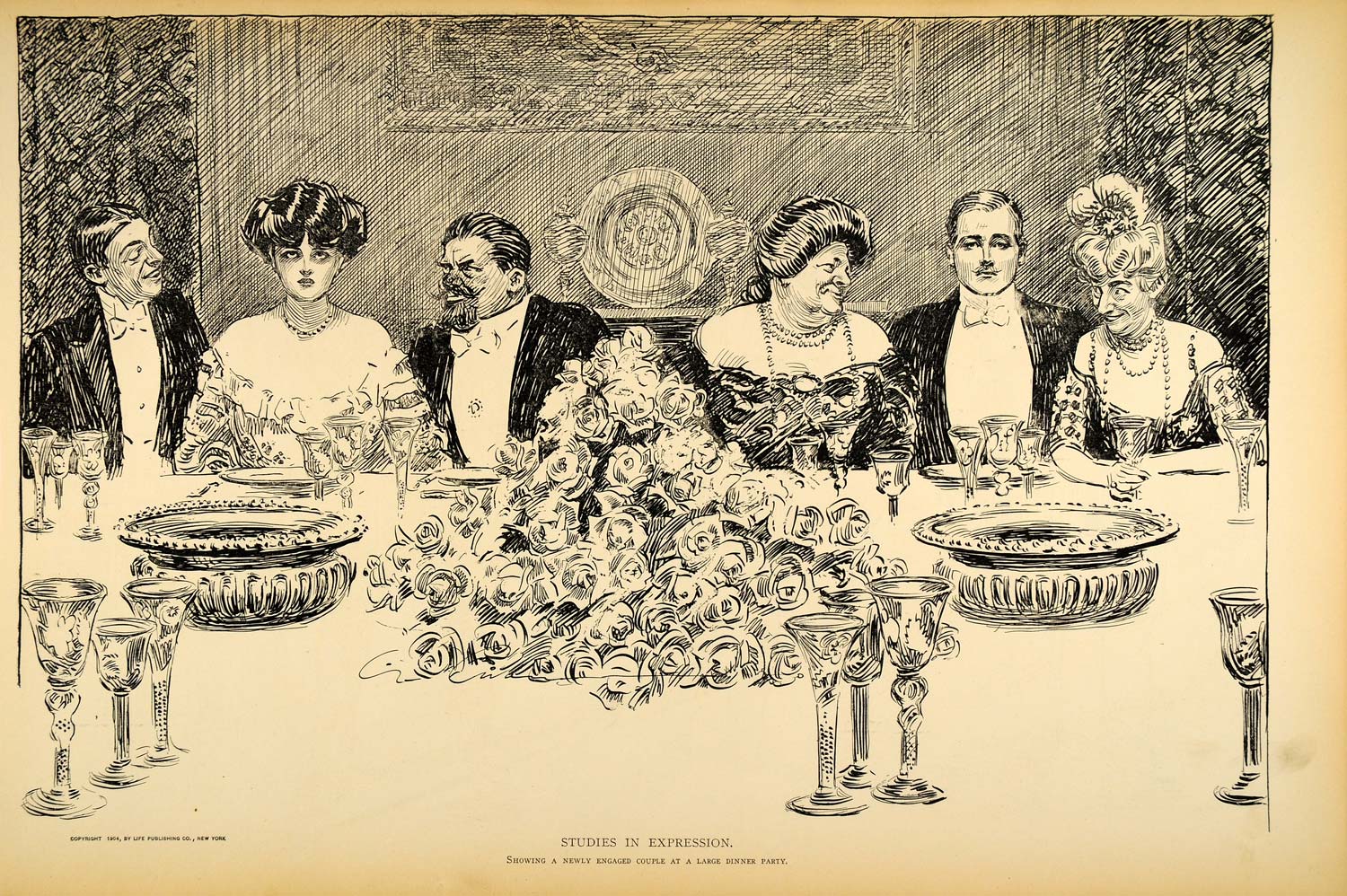 "Showing a newly engaged couple at a large dinner party." This is an original 1906 halftone print of a drawing by Charles Dana Gibson. The drawing has a copyright date of 1904 by Life Publishing Co. (Please note that, typical of halftone prints, there is printing on the reverse.)