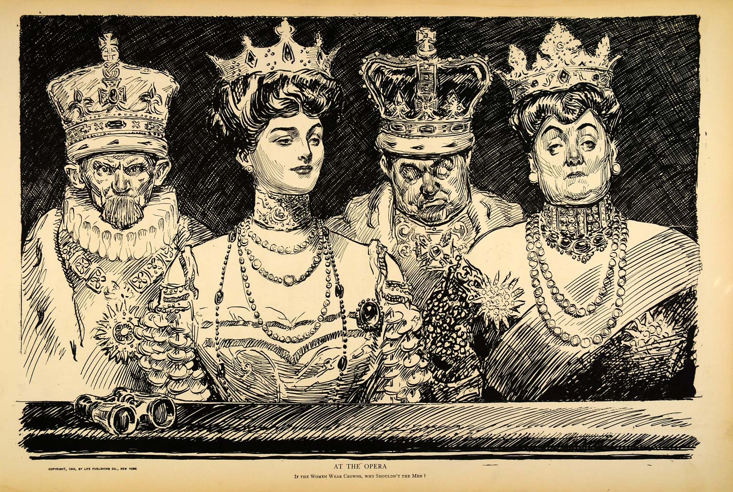 "If the women wear crowns, why shouldn't the men?" This is an original 1906 halftone print of a drawing by Charles Dana Gibson. The drawing has a copyright date of 1904 by Life Publishing Co. (Please note that, typical of halftone prints, there is printing on the reverse.)
