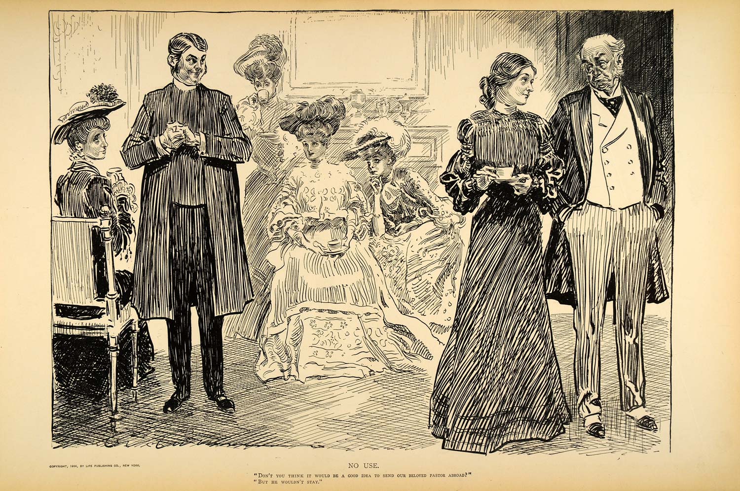 "Don't you think it would be a good idea to send our beloved pastor abroad?" "But he wouldn't stay." This is an original 1906 halftone print of a drawing by Charles Dana Gibson. The drawing has a copyright date of 1904 by Life Publishing Co. (Please note that, typical of halftone prints, there is printing on the reverse.)