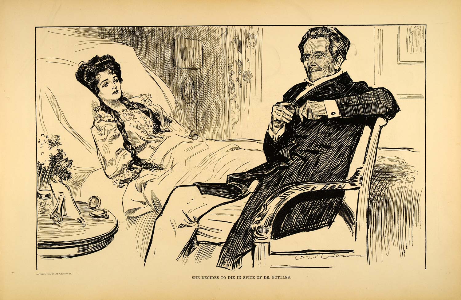 1906 Print Charles Dana Gibson Girl Sick Bed Doctor Bottles Art Drawing Sketch