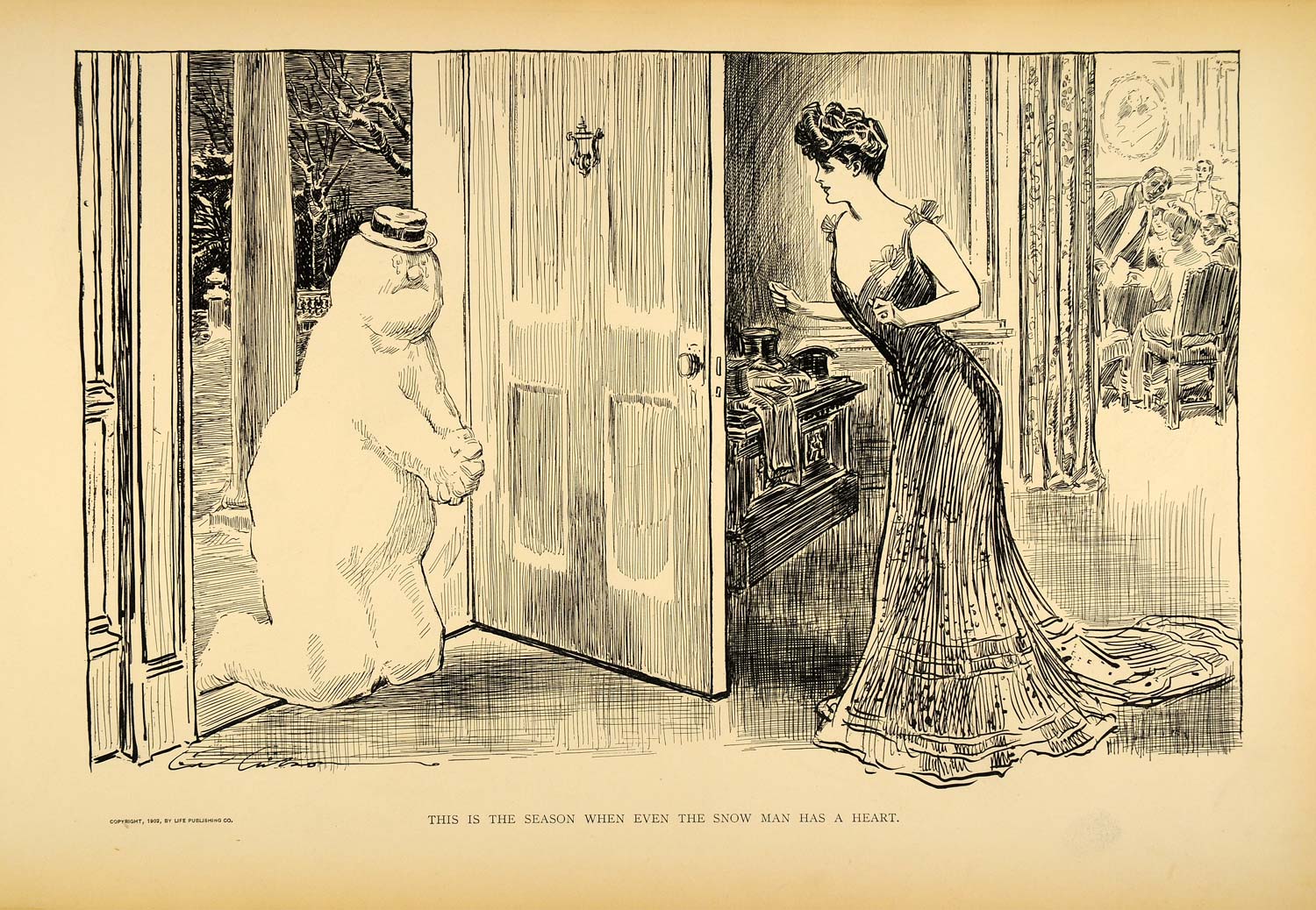 This is an original 1906 halftone print of a drawing by Charles Dana Gibson. The drawing has a copyright date of 1902 by Life Publishing Co. (Please note that, typical of halftone prints, there is printing on the reverse.)