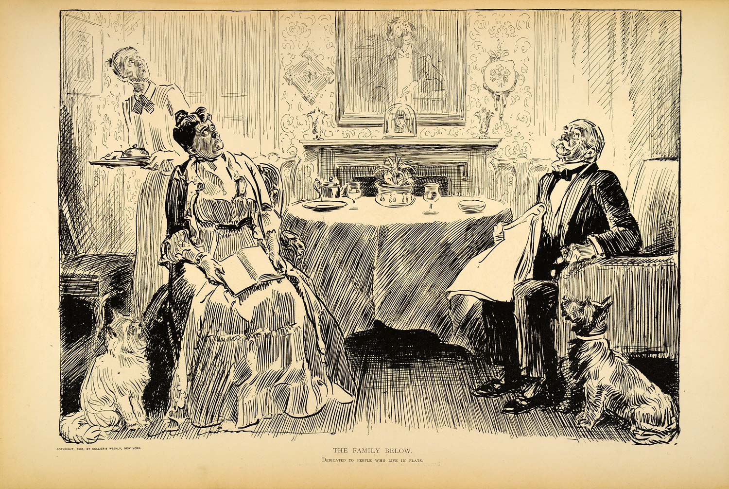 "Dedicated to people who live in flats." This is an original 1906 halftone print of a drawing by Charles Dana Gibson. The drawing has a copyright date of 1904 by Collier's Weekly. (Please note that, typical of halftone prints, there is printing on the reverse.)