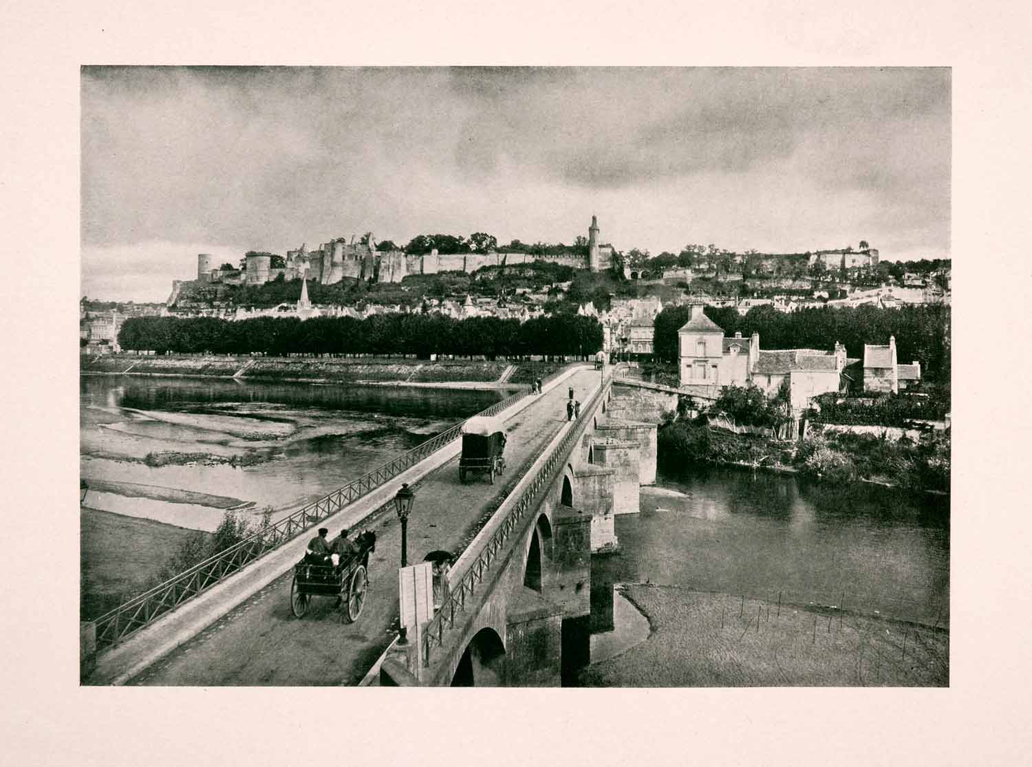 This is an original 1906 duotone halftone print of "Château and town of Chinon, with bridge across the Vienne."