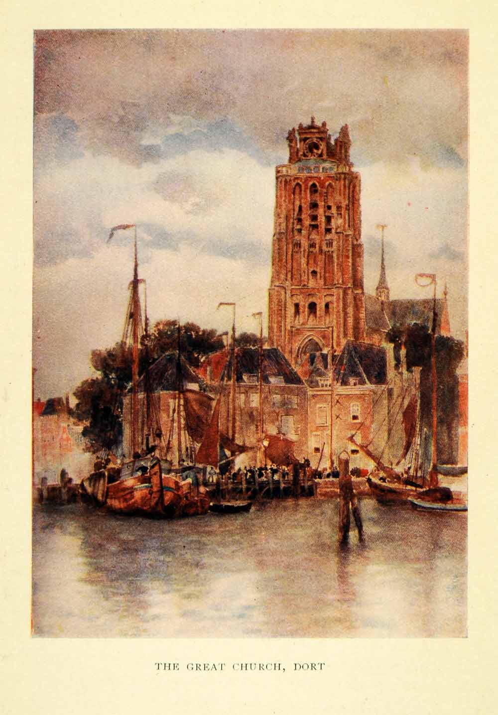 This is an original 1906 color print of the Great Church in Dort, the Netherlands, with a beautiful view of one of the canals in front of it, filled with quaint sailboats.