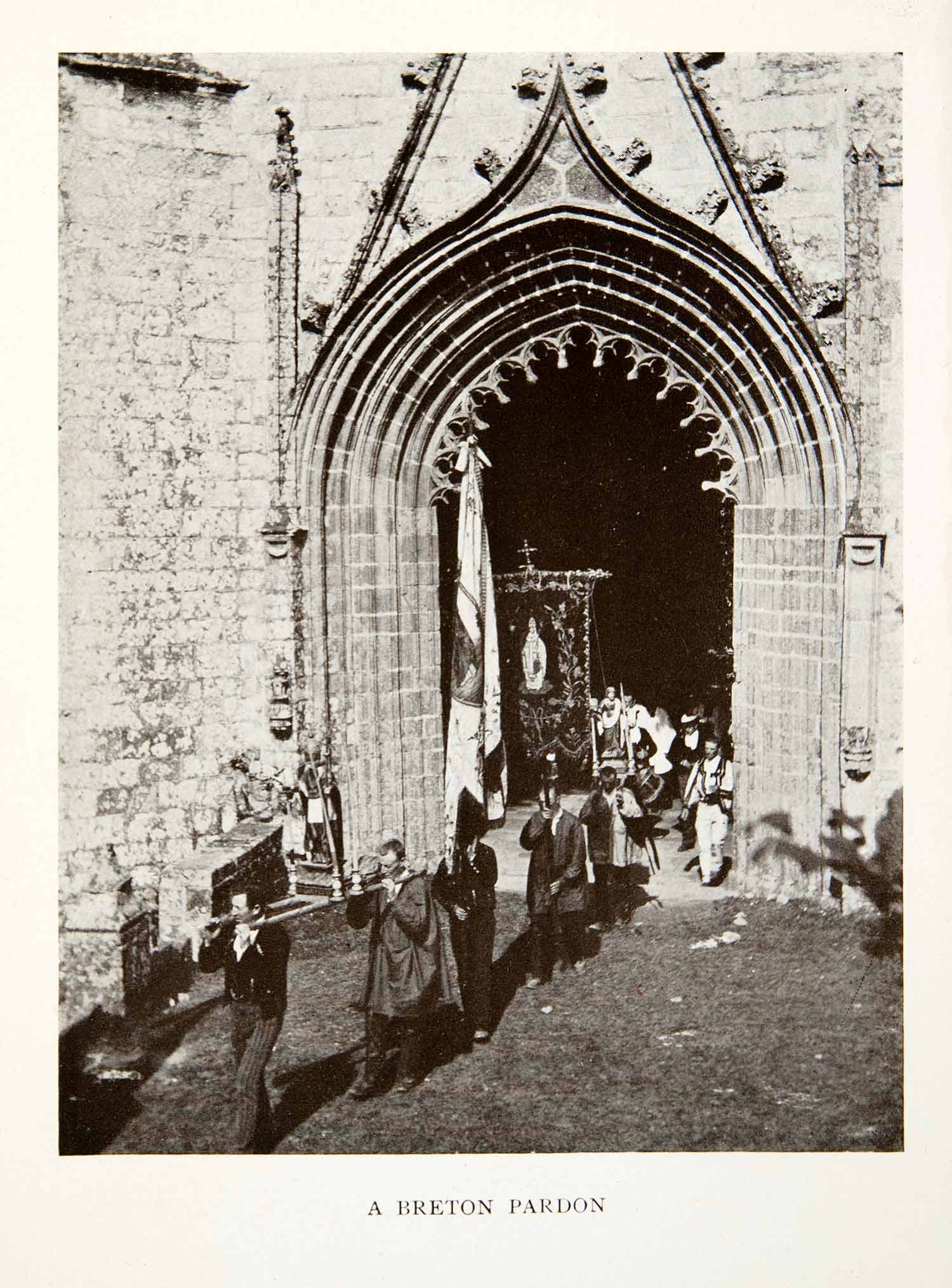 This is an original 1906 black and white halftone print of a pardon ceremony taking place in front of a cathedral.
