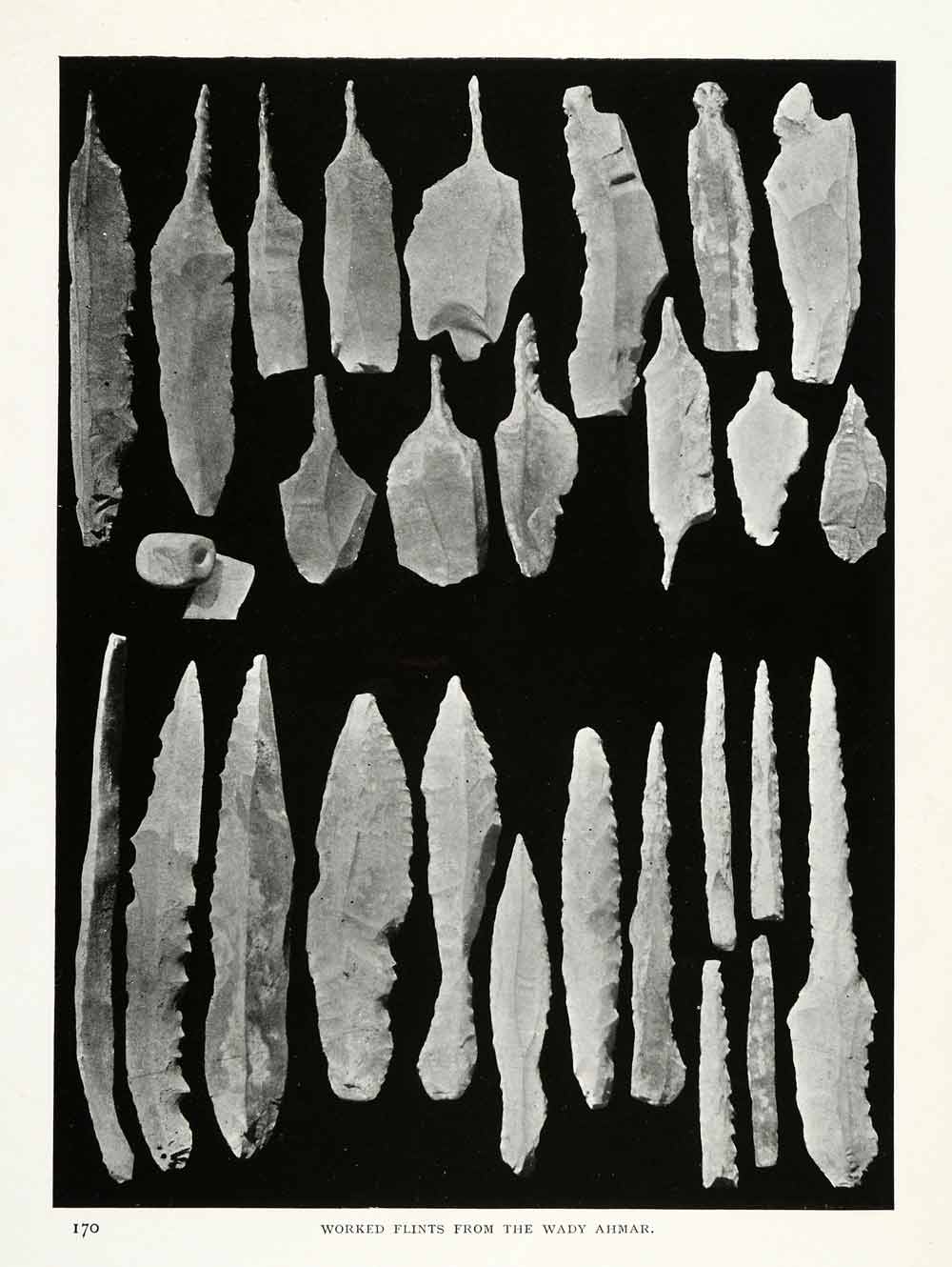 This is an original 1906 halftone print of worked flints from the Wady Ahmar; Sinai, Egypt.