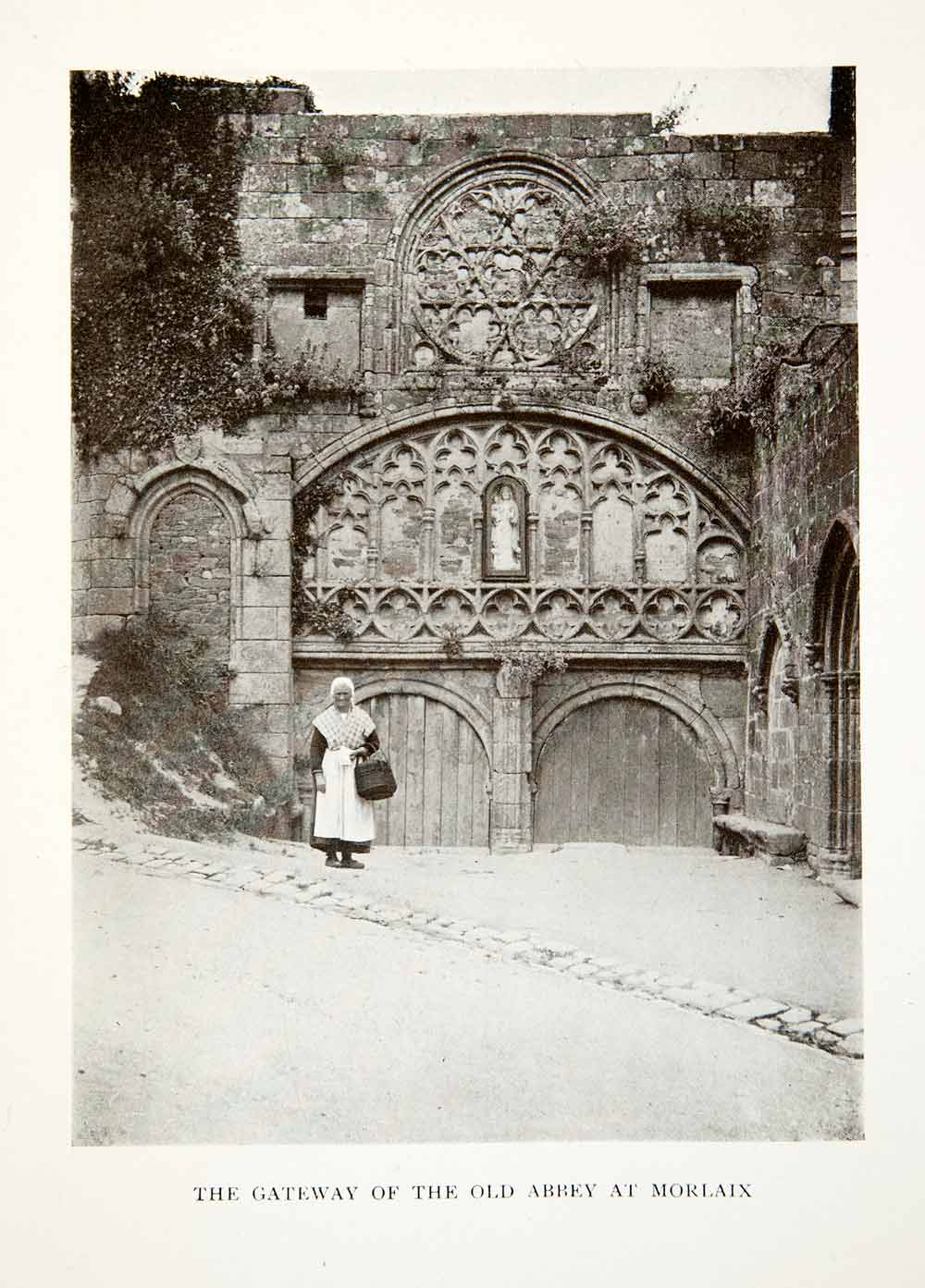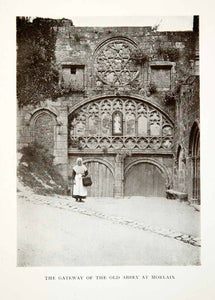 This is an original 1906 black and white halftone print of the gateway of the abbey of Morlaix in Finistere, France.