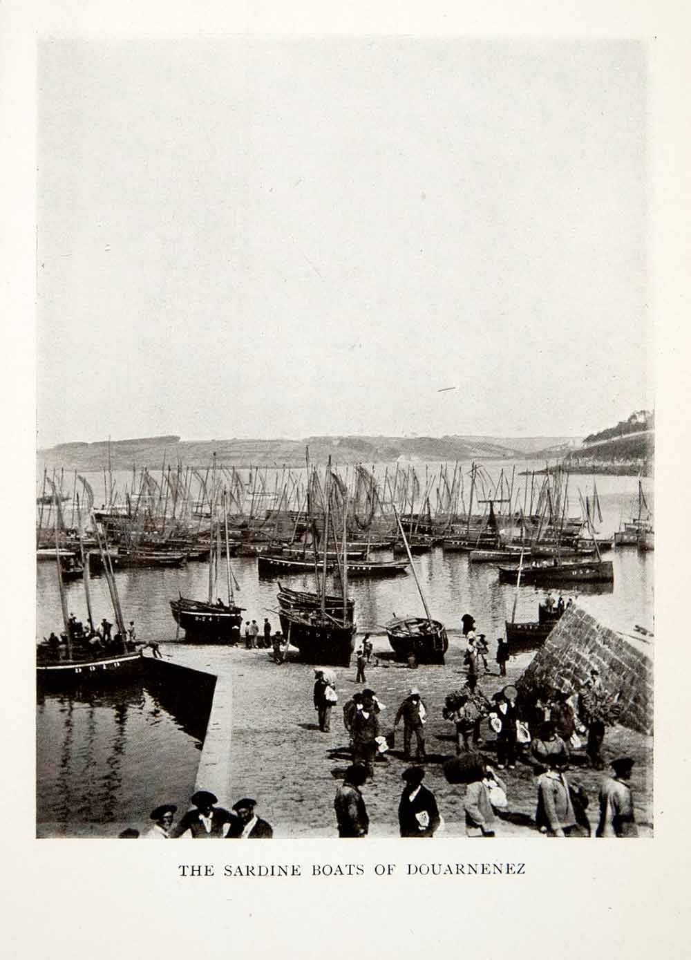 This is an original 1906 black and white halftone print of harbor filled with boats in Douarnenez, France.