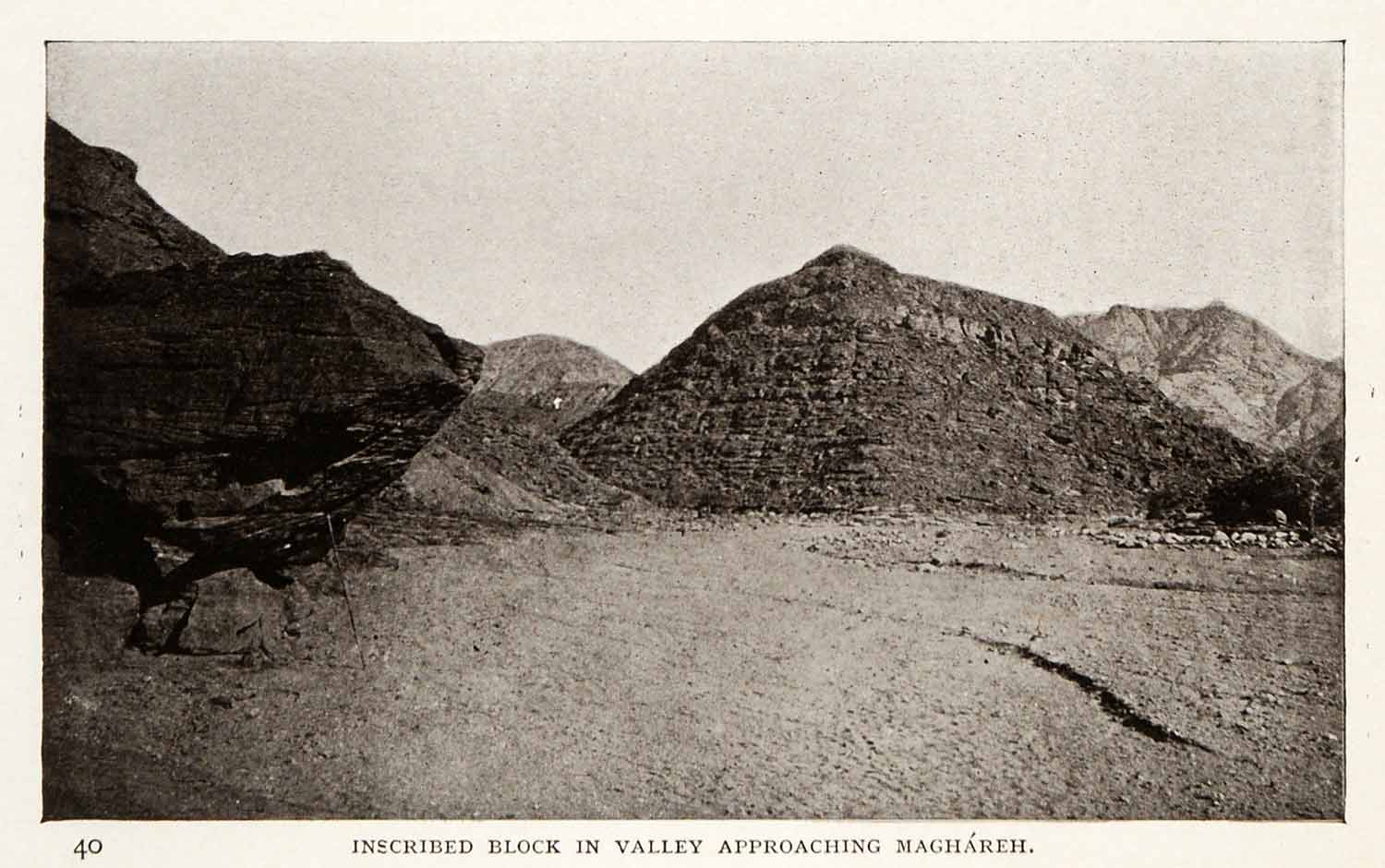 This is an original 1906 sepia halftone print of an inscribed block in the valley approaching Maghareh, Sinai, Egypt.