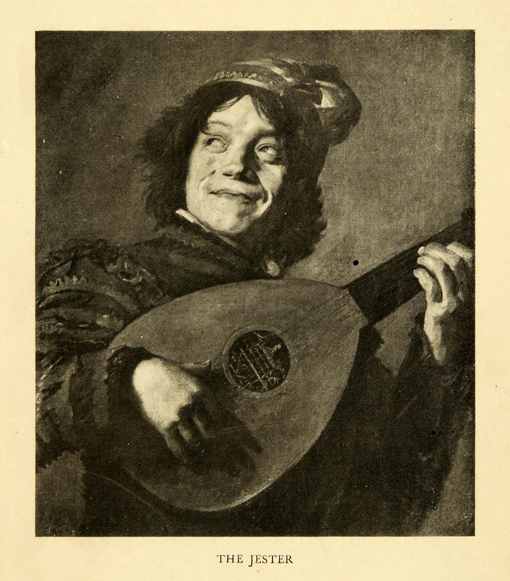 This is an original 1906 halftone print of "Jester with a Lute," sometimes known as, "Buffoon with a Lute," originally painted between 1624 and 1625. Frans Hals (1580-1666), was a Dutch painter known for his brushwork and his portraits. A statue of the artist stands in Florapark of Haarlem, Netherlands (Nederland).