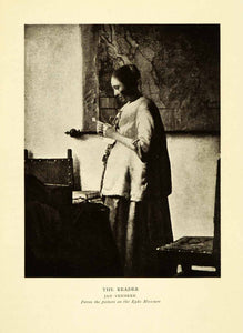 This is an original 1906 halftone print of a piece by Johannes Vermeer (1632-1675) entitled here as "The Reader" but also commonly known as "Woman in Blue Reading a Letter." In addition to speculations that she may be pregnant, there have also been guesses as to the content of her letter. Some argue that due to the map of the Netherlands behind her it is possible that she's hearing from a traveling husband or relative, others guess that because of the half-hidden box of pearls on the table, it must be from a lover. Either way, it remains a unique piece, especially because this is one of the only works by Vermeer that does not include corner features on the back wall.