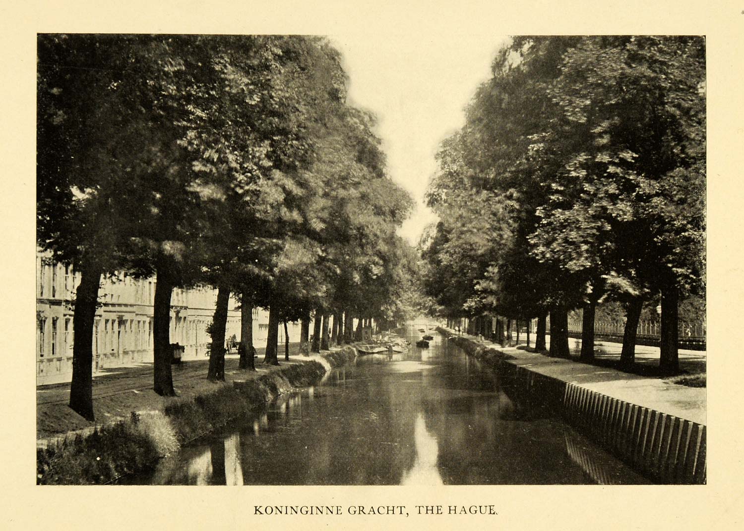 This is an original 1906 halftone print of the Koninginne Gracht of the Hague, South Holland, Netherlands (Nederland).